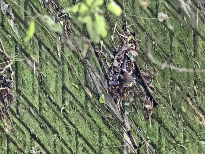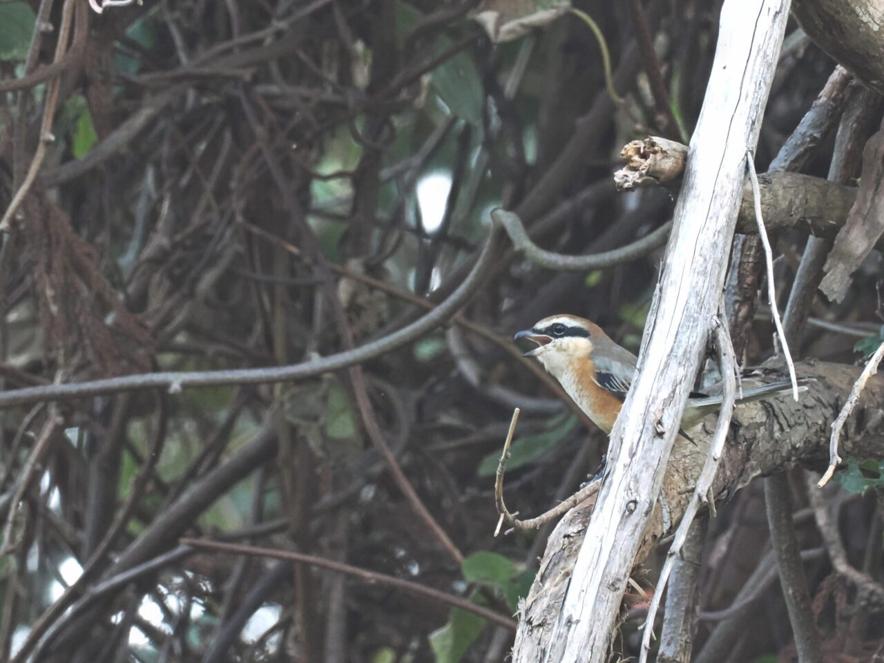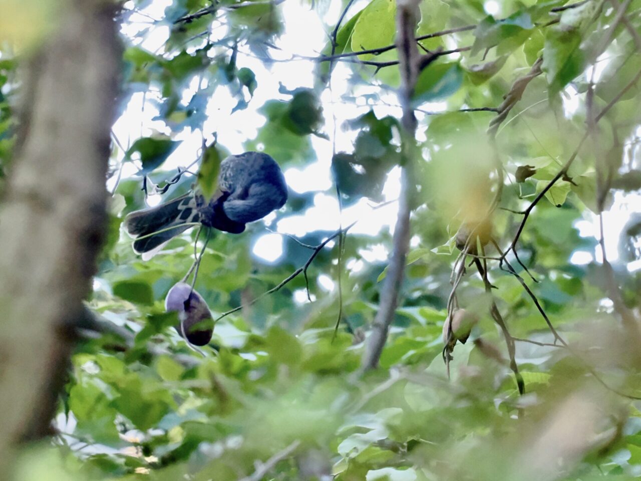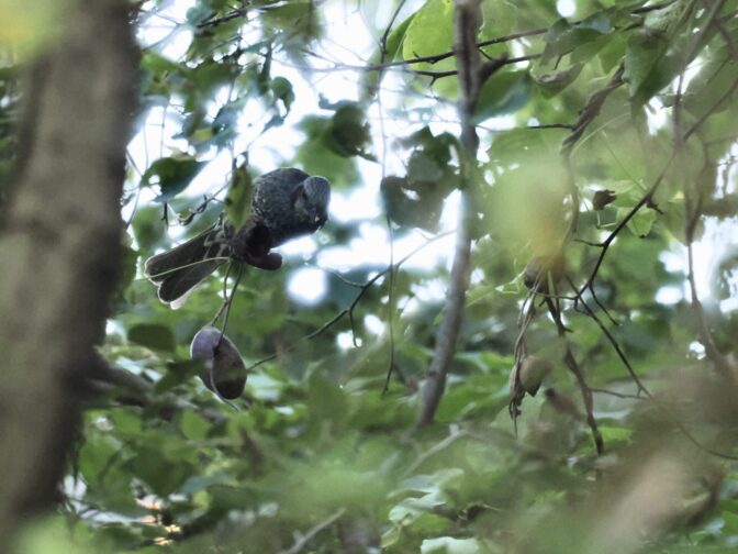 藪の中で蔓にぶら下がっている鳥が見えたので、とりあえずパシャリ。あとで、露出補正して拡大するとヒヨドリがアケビの実を食べていました٩( ‘ω’ )و。