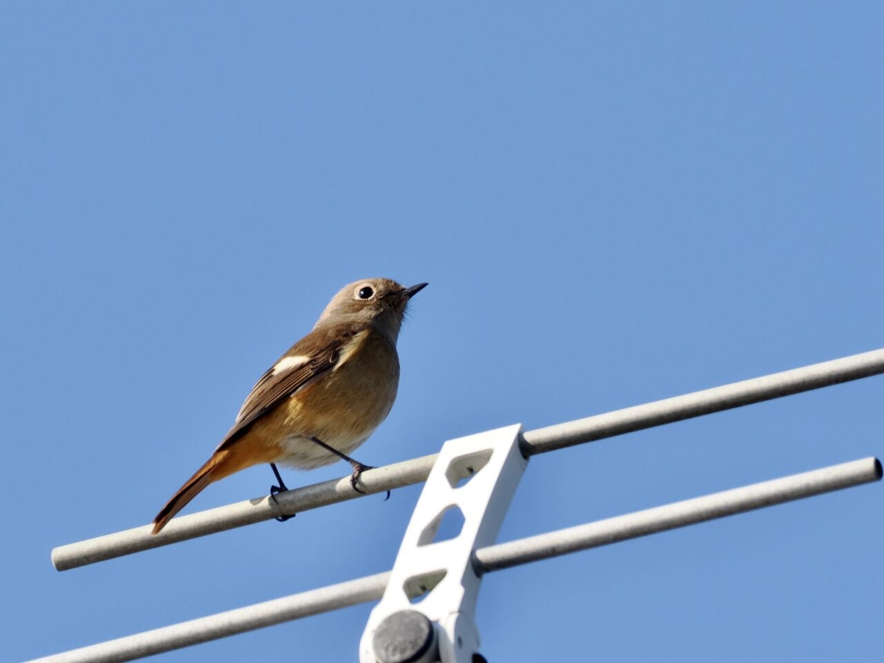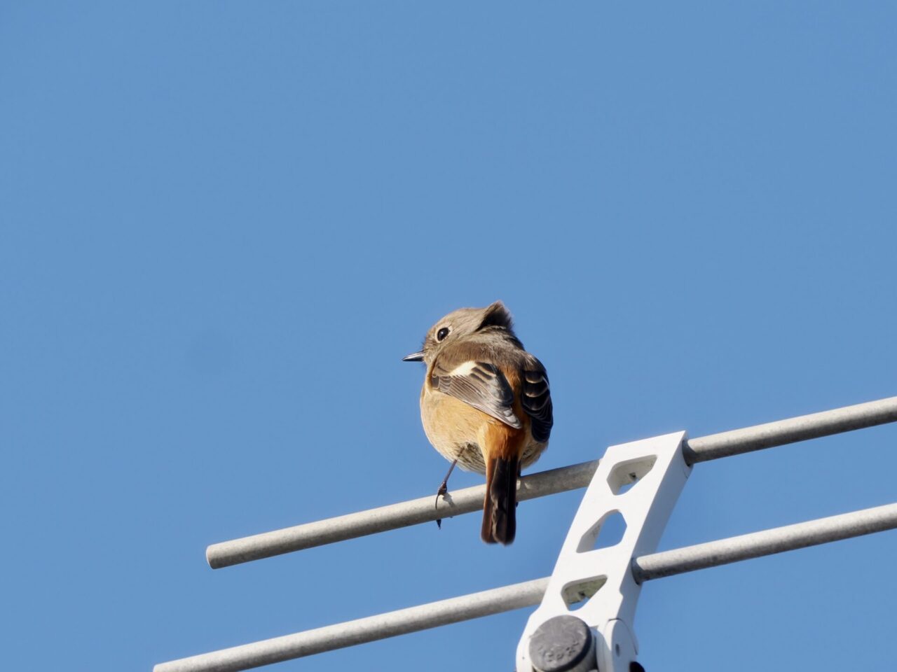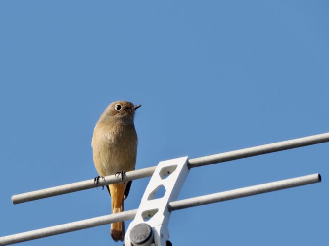 30日の朝、家の外で「ヒッヒッ カッカッ」と懐かしい鳴き声、近所の電柱にオジョウ(ジョウビタキ♀)が居たのでカメラを持って外に出てパシャリ✌︎(‘ω’)✌︎。オジョウは、付近の家のTVアンテナや電柱を渡り歩き(飛び)ながら「ヒッヒッ カッカッ」と挨拶兼テリトリ確保の巡察をしていました。