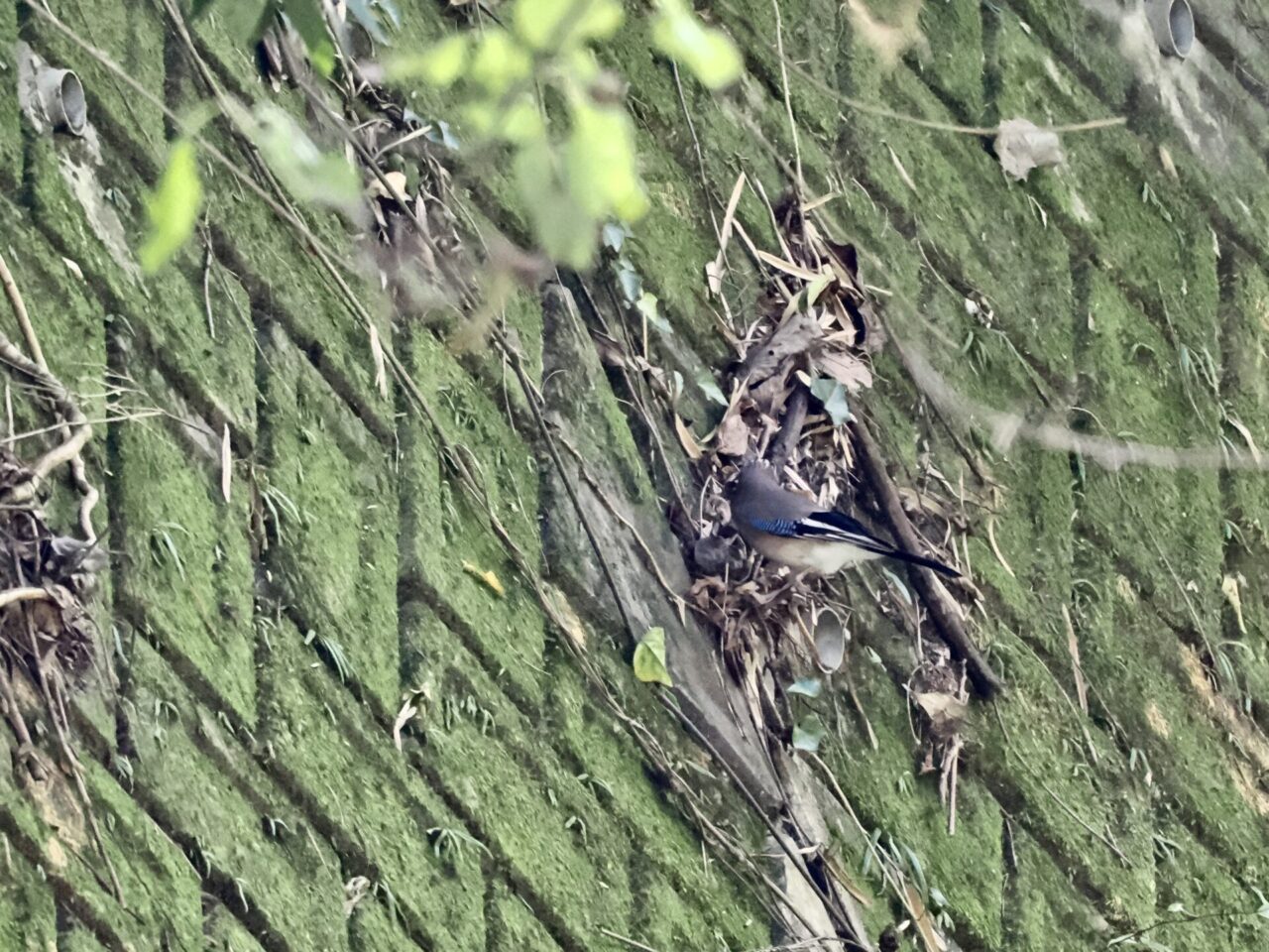 対岸の護岸ブロック壁面の落ち葉の吹き溜まりに何やら鳥の影を見つけたので、取り敢えずパシャリ。あとで拡大してみるとカケスがドングリらしき物を咥えていました✌︎(‘ω’✌︎ )。