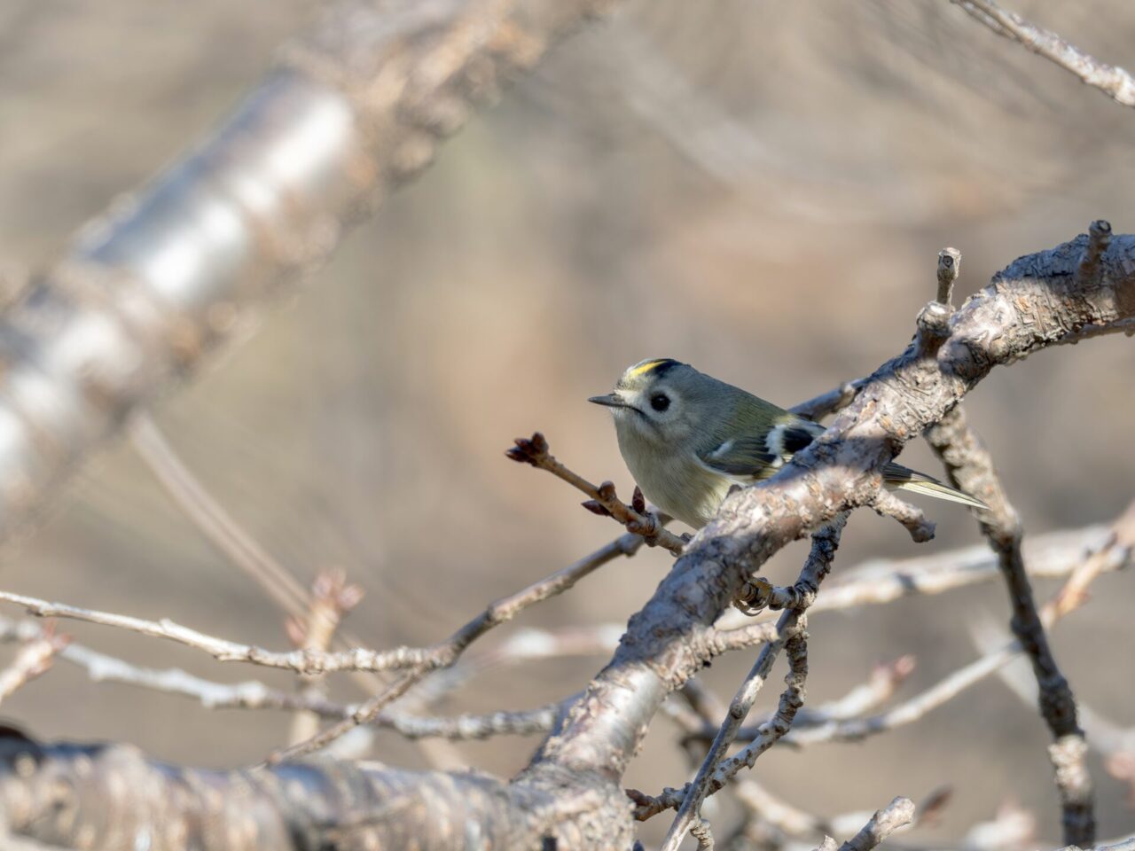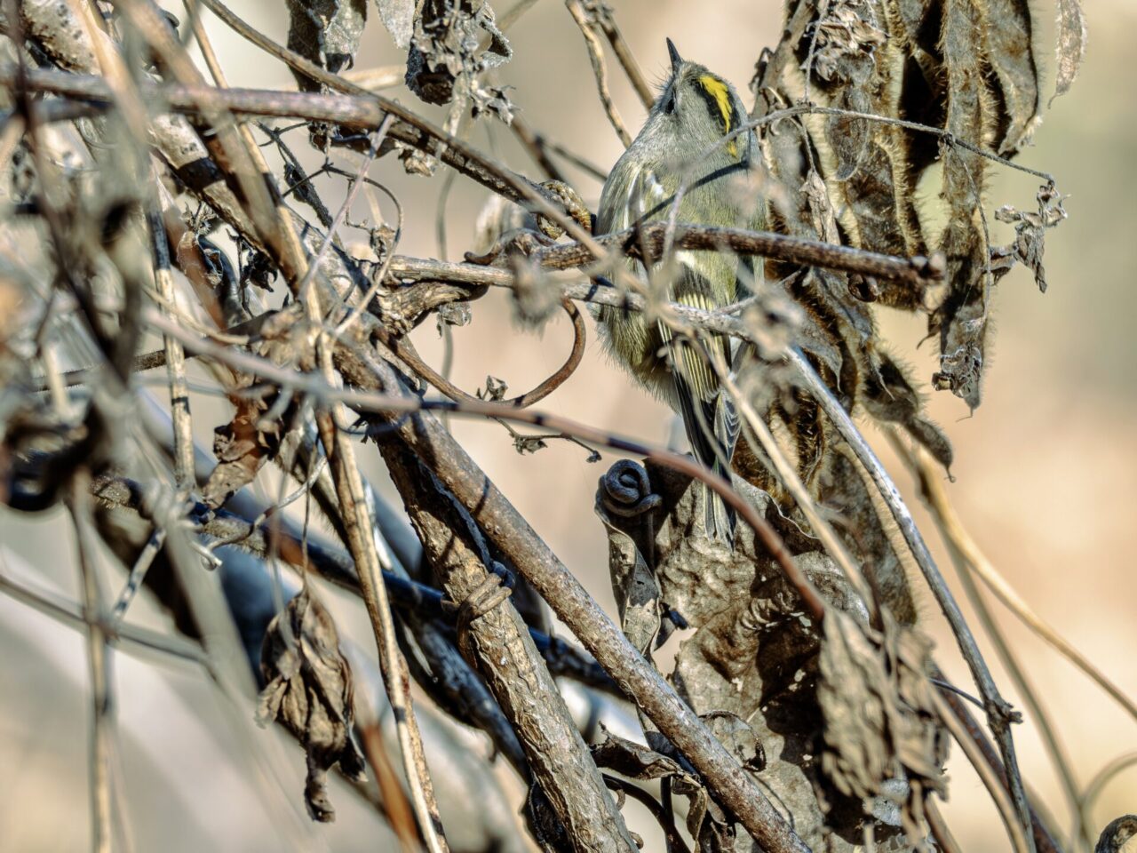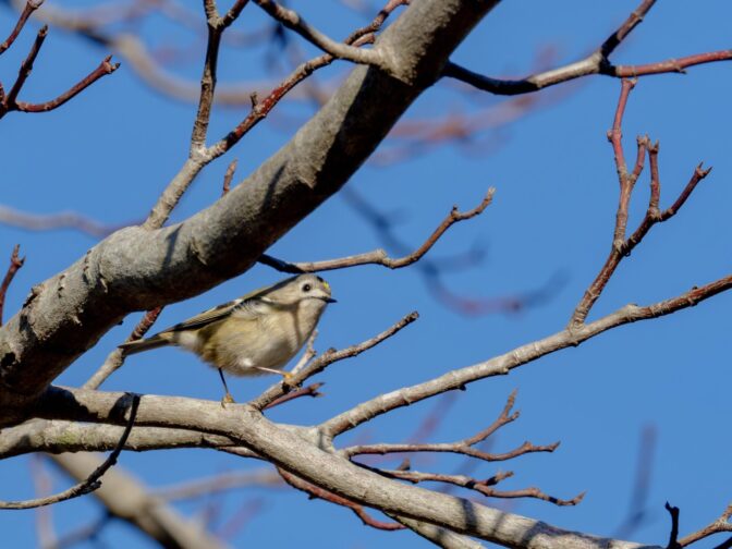 キクちゃん(キクイタダキ)に会えました、2度目です、1度目は’24年3月9日なので約2年ぶりの遭遇です✌︎(‘ω’✌︎ )。26日は風が強く吹いていて、いつも小鳥が水飲み&水浴びしている”小鳥の湯”にはヒヨドリさえ居ず、小鳥さんとの出会いは期待せず、ウオーキンのつもりで上流の方の足を伸ばしてみました。比較的風当たりの穏やかな、寒桜の並木の下側の藪からウグイスの地鳴きとジュリ・ジュリと言うエナガの群れの鳴き声が聞こえ、撮影開始。群れの中に、緑色だがメジロとは違う小さな小鳥が、動きが素早くてなかなか種類が特定できません٩( ‘ω’ )و。撮影チャンスを伺いながら、エナガとウグイスを撮影し約10分後に、寒桜の枝の上に現れたので、何枚か撮影することができました✌︎(‘ω’)✌︎。ただ、動きが素早く、ほとんどが藪の中での撮影なので、ピンボケや木の枝の影はご容赦下さいm(_ _)m。