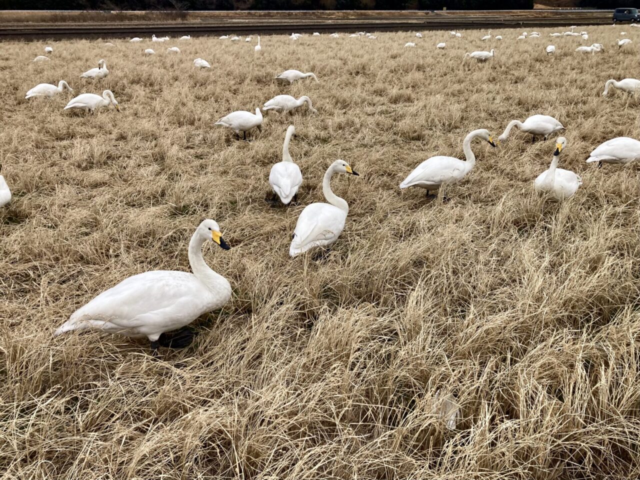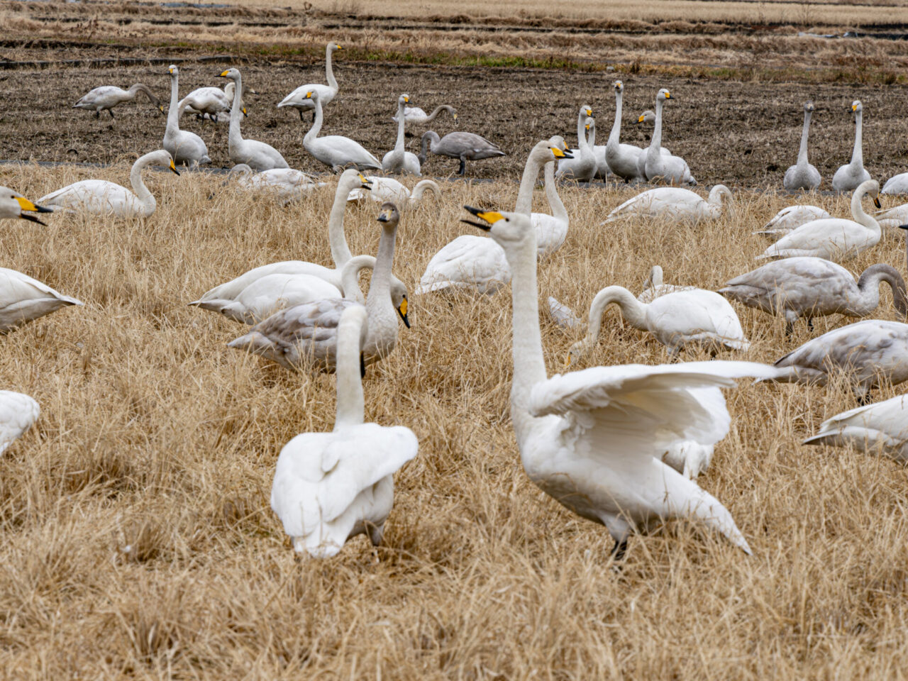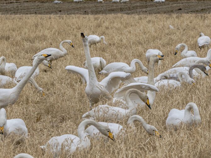 田圃で採餌する白鳥の群れ