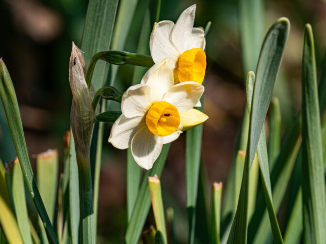 陽だまりでスイセンが咲き始め小さな虫たちが寄ってきている(右)