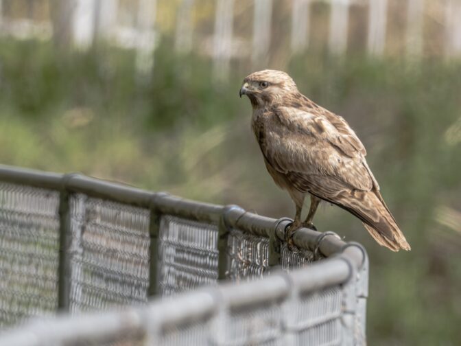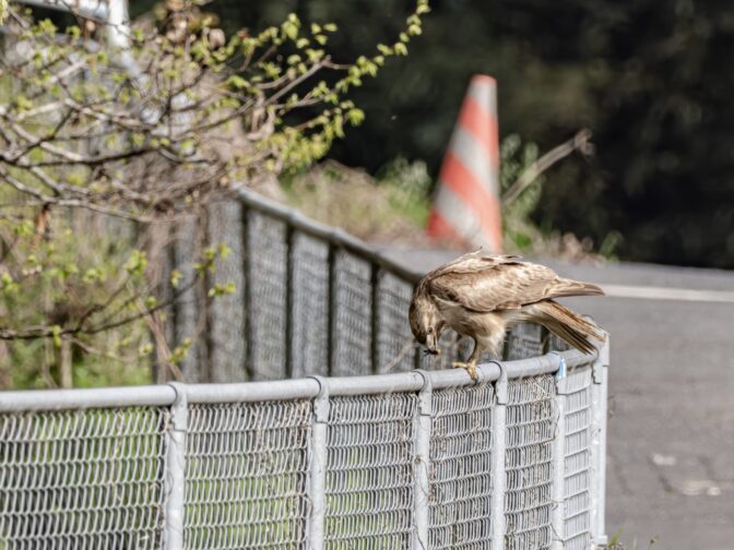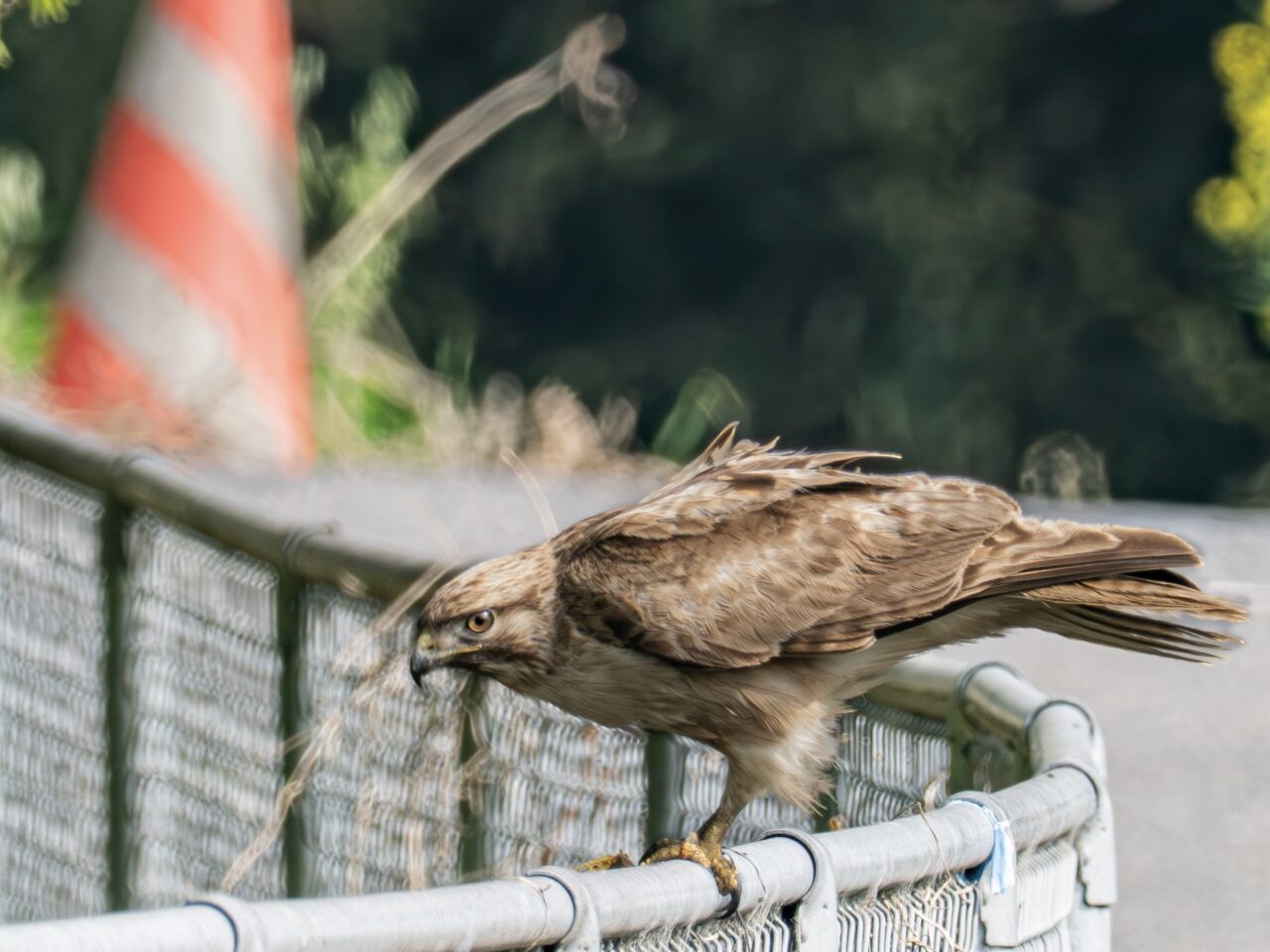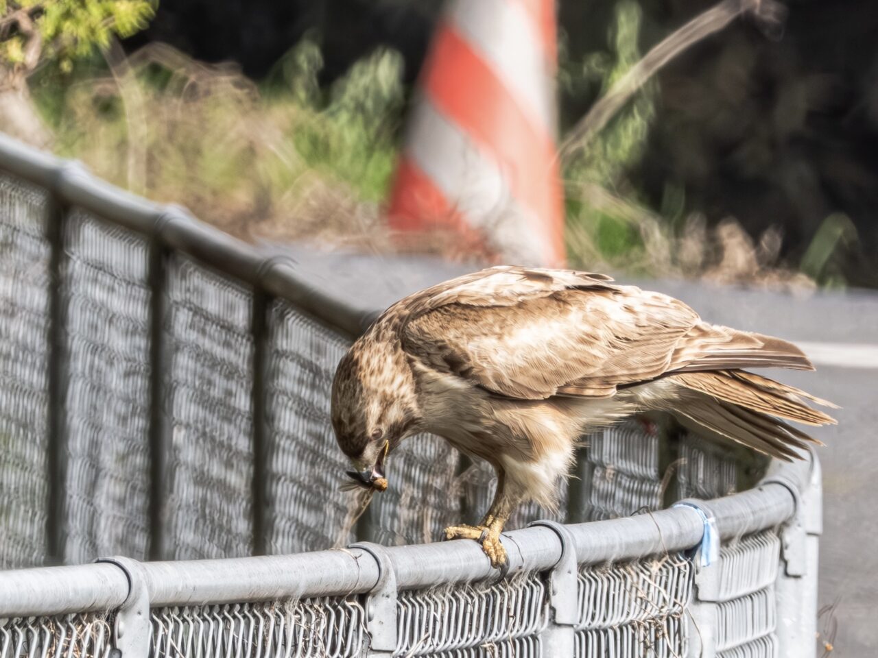 自衛隊駐屯地下の小場江用水路沿いを散歩中に、路端の草むらからノスリが飛び出し、フェンスに止まり何かを食べていました。とりあえず、カメラをリュックから取り出し、パシャリパシャリ撮影しました✌︎(‘ω’)✌︎