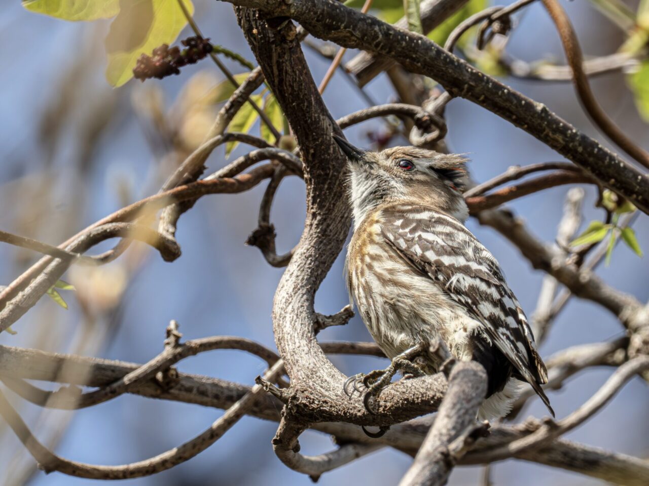 この日も、蔓が絡まった高い木の上に居ましたが、蔓の隙間から青と黒の縞模様の羽(雨覆)が見えます、